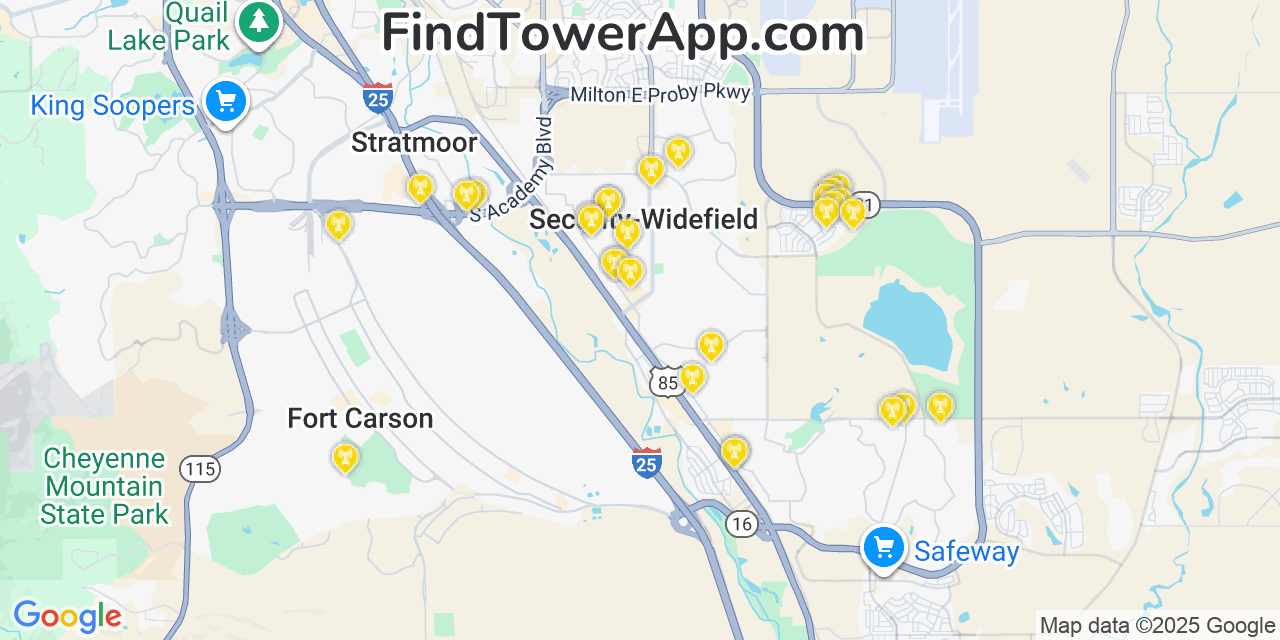 Our analysis of the Security Widefield area has identified 22 primary AT&T cell tower locations within the immediate vicinity. These towers provide coverage across different neighborhoods in Security Widefield, with varying signal strengths depending on your distance from each tower, building density, and local terrain. The tower distribution in Security Widefield shows concentrated coverage in central areas with expanded reach to surrounding neighborhoods.